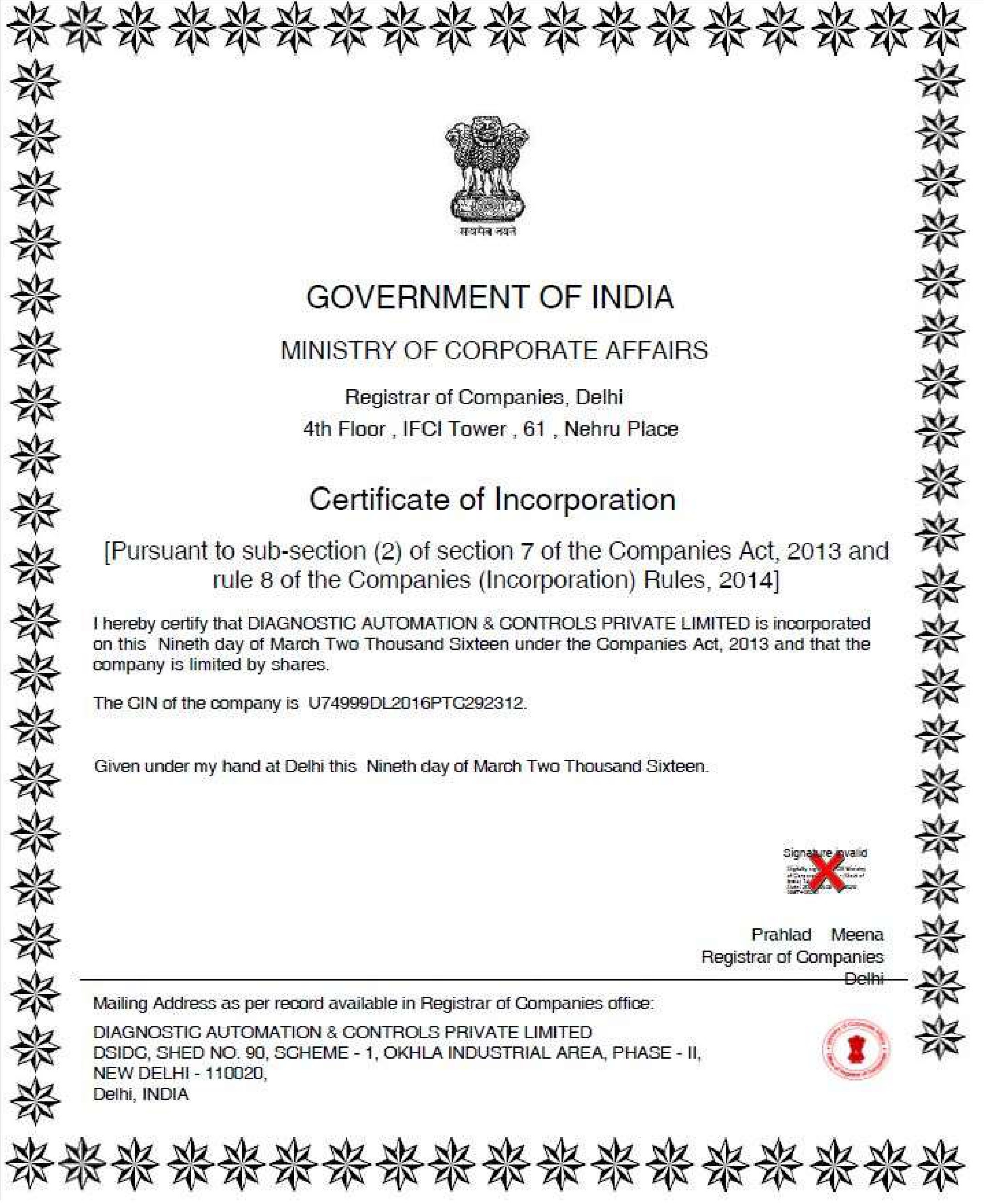 Diagnostic Automation & Controls Private Limited incorporated under the companies act 2013.